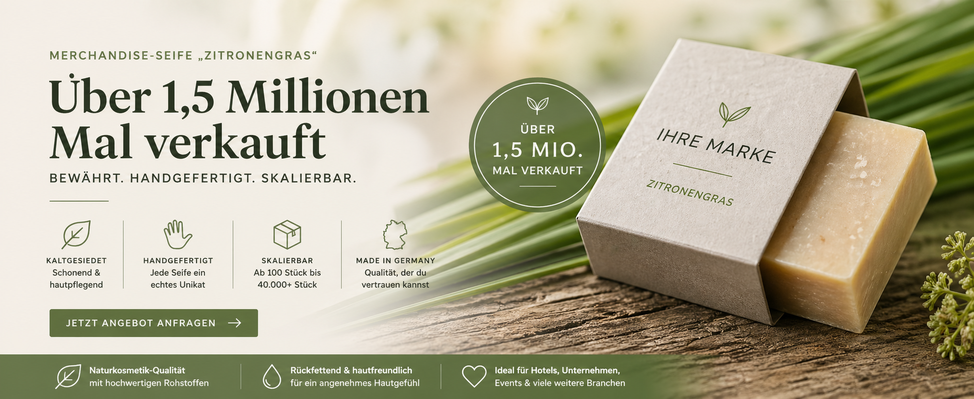 Über 1,5 Millionen verkaufte Seifen – bewährt als Giveaway Seife, Werbeartikel und Kundengeschenk für Unternehmen in ganz Deutschland.